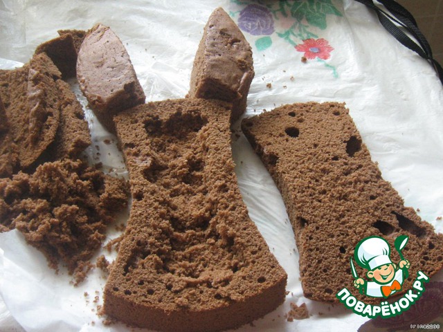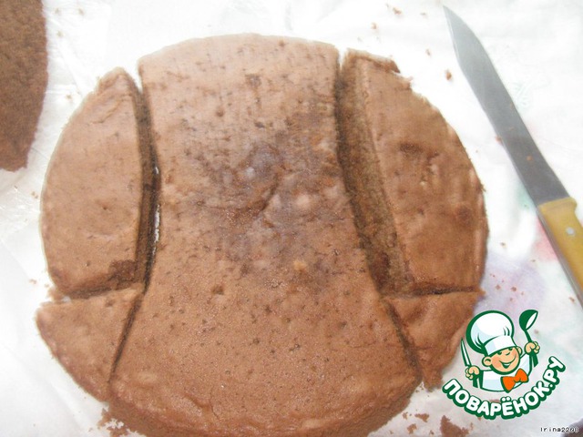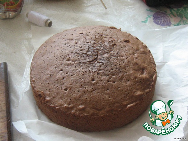 Печем бисквит. Он может быть любой. По моему рецепту - смешать муку, какао и разрыхлитель. Желтки взбить с половиной сахара добела. Понемногу добавить масло и кипяток. Белки взбить отдельно с другой половиной сахара, соединить с желтковой массой и осторожно добавить мучную массу. Выпекать при 180-190 град. 30 минут. Этот бисквит получается рассыпчатым и мягким. Он у меня сутки отлеживался.