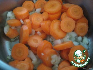 В металлической кастрюле растопить сливочное масло и потушить лук, чеснок и морковь около 7-10 минут (не зажаривая); посолить, поперчить.