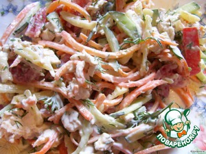 Довольно легкий салатик с остринкой корейской морковки и свежестью огурчика… делается в считанные минуты и симпатично смотрится на столе