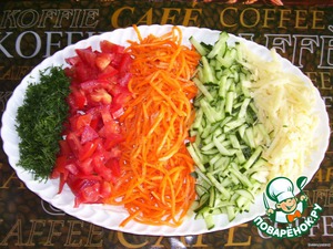 И собираем наш салат- в середину блюда на слой курицы кладем полосу корейской моркови, по бокам помидоры, огурцы, сыр и мелконарезанный укроп.