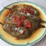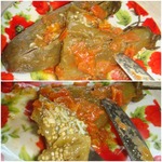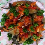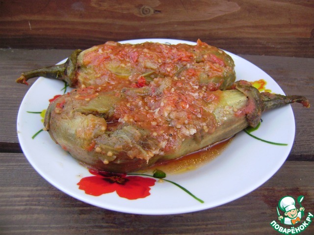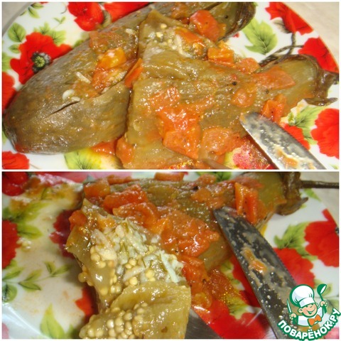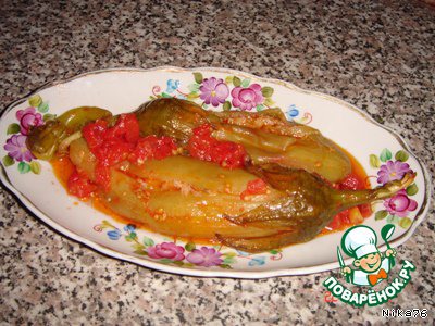 Нарезать помидоры + 1 стакан воды + растительное масло + баклажаны. Я еще добавила один маленький острый перчик. Поставить на огонь и варить до готовности.