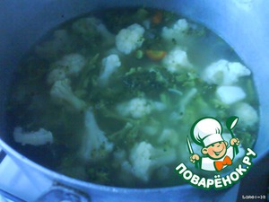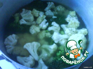 Извините, фотографировала не с начала. Налить в кастрюлю растительное масло обжарить мелко порезанный лук. После чего добавить порезанный картофель, обжарить минутку, добавить брокколи и цветную капусту. Залить все горячим бульоном.