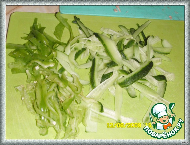 • Огурцы разрезать пополам, чайной ложкой, извлечь сердцевину(не убирала), а затем нарезать ломтиками по диагонали. Мелко нарезать острый перец. Ломтики огурцов и перец добавить в миску с мясом. Вместо острого чили перца (не было) положила зеленый болгарский перец. Мой совет. Нарезать лучше овощерезкой.