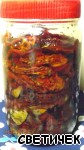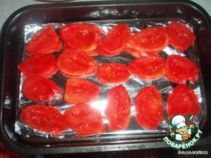 ... и второй - это духовка. Лист выложить бумагой, смазать также маслом, выложить помидоры и поставить в духовку с температурой 100*С, если в духовке нет такой температуры (у меня, например, минимальная 120*), тогда поставить температуру на минимум и немного приоткрыть дверцу духовки.