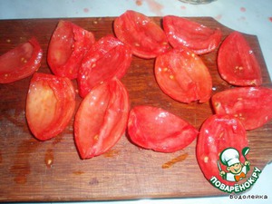 Дальше разрезать помидоры на 4 части и вынуть серединку с семенами. У нас получились вот такие "лодочки".