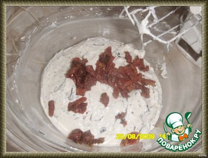 Мелко порезать вяленые помидоры. Добавить в сырную смесь и хорошенько перемешать.