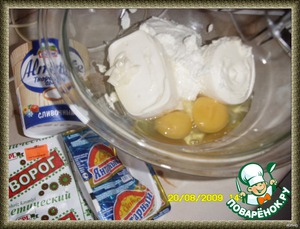 (вместо рикотты положила творог, сливочного сыра была 1 банка-150 гр, потому добавила еще пачку янтарного сыра) -
