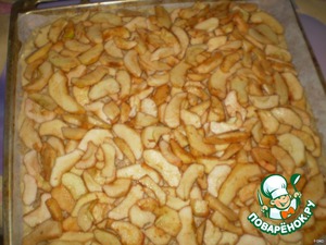 А сверху разложить порезанные тоненькими ломтиками почищенные яблоки. Сверху посыпать ванильным сахаром и по желанию корицей. Запечь до золотистого цвета при температуре 200 градусов.