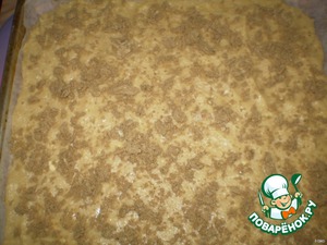 Смешать маргарин,сахар,яйца и замесить тесто постепенно подсыпая муку.Мягкий маргарин сахар и яйца смешиваю просто рукой. Этого количества как раз достаточно на большой противень. Для удобства застелить противень бумагой для выпечки распределить мокрой рукой тесто по противню , равномерно раскрошить по поверхности халву
