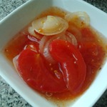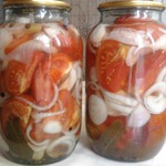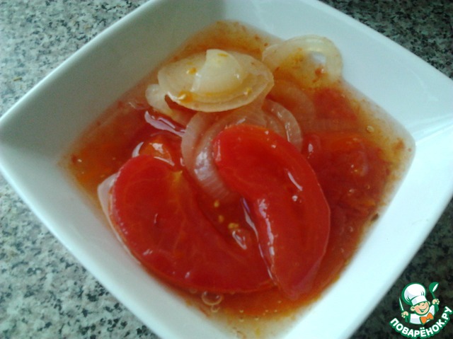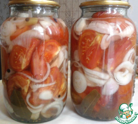 Разноцветные дольки помидоров в желированном, дрожащем, необыкновенно вкусном маринаде, и с хрустящим лучком, съедаются без остатка.