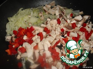 Готовим соус. В достаточно большой посудине обжариваем мелко нарезанный лук, после того, как он позолотится, кидаем к нему шампиньоны, порезанные мелкими кубками, - всё это обжариваем до красивого цвета и вкусного запаха. Добавляем сметану - только жирную, она на свернётся, обжариваем... Доливаем протёртые томаты, зелёный перец и даём закипеть. Чили добавляем исключительно по вкусу!
