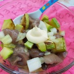 Смешаем их с кабачками и добавим майонез. Получится очень вкусный салат, по вкусу напоминает мясной.