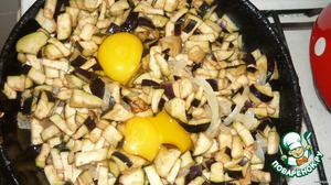 Добавить синенькие, перемешать. Вбить 3 яйца, тщательно перемешать, чтобы яйца полностью обволокли синенькие.