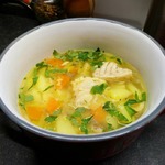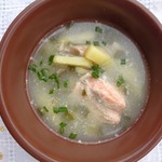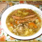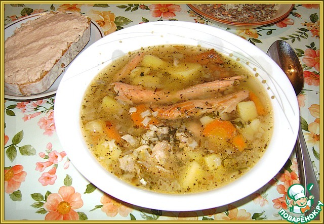 , варить 10 минут. Главное при этом бульон не солить и варить на слабом огне. Затем засыпать пассерованые овощи. Через 5 минут настает "звездный" час филе. Его надо достать из морозилки, перемешать и закинуть в бульон. Теперь пришло время солить супчик! Также можно поперчить, добавить лим. сок. Варить 7 минут и на последней минуте добавить огня и налить водку.