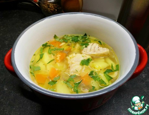 Процеженный бульон снова ставим на огонь и закидываем туда картошку. Я люблю густой суп, по-этому добавила рис, можно пшено, а можно крупу не добавлять