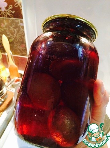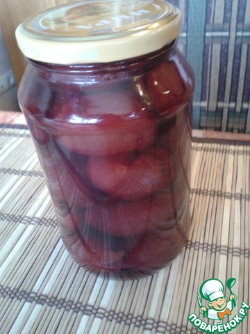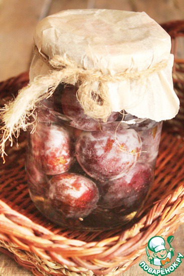 Маринад (ингредиенты для маринада даны из расчета на 10 литровых банок): закипятить воду, добавить сахар и в конце - уксус (без соли). Через месяц сливы уже готовы. Приятного аппетита.