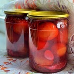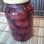 Рассказываю подробней-для своего удобства я использую глубокое сито, как для фритюра, опускаю его со сливами в кипящую воду, жду пару минут, как только слива начнёт менять цвет, сразу вытаскиваю и опускаю в тазик с холодной водой, воду периодически меняй, вода из под крана, раскладываешь сливы по баночкам, добавляешь в каждую специи, заливаешь маринадом и стерилизуешь. Главное, не переварить сливы в кипятке, чтобы фляки не получились, а остались целыми. Вроде все!