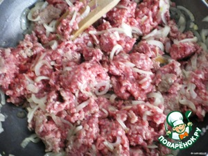Фарш разминаем и выкладываем на сковороду, обжариваем вместе с луком.