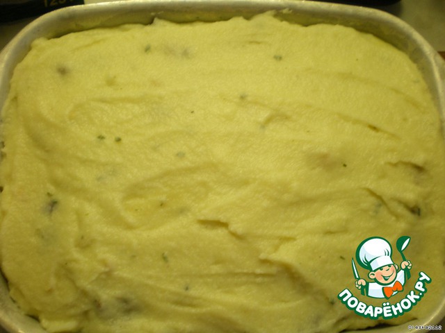 Сверху выкладываем оставшееся картофельное пюре и разравниваем. Можно посыпать тёртым сыром.