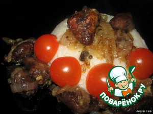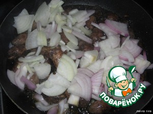Сердечки обжарить на растительном масле, на сильном огне, до румяной корочки. Добавить лук, нарезанный соломкой. Огонь убавить до среднего.