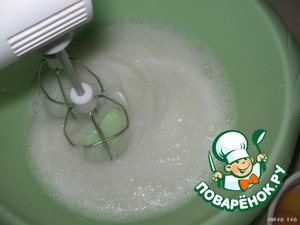 Взбиваем миксером на самой большой скорости. Начинаем постепенно добавлять сахар (100г.).