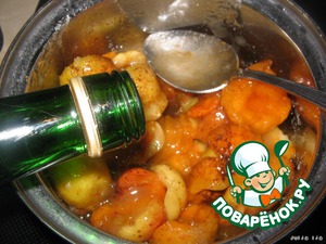 Добавить коньяк и поставить на огонь. Готовить помешивая, пока не выпарится половина жидкости.