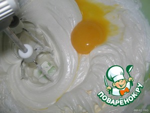Добавляем по одному желтки. Здесь уже долго взбивать не нужно. Просто добавили желток, смешался, добавляем другой сразу.
