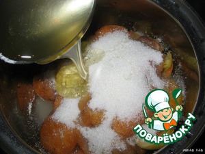 Для начала разберёмся с абрикосами. Их нужно вымыть, освободить от косточек. Выложить их в сотейник, добавить сахар (50 грамм) и мёд.