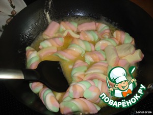 - по рецепту надо вмешать к концу орехи. Н-е-е, мы не идём простым путём, орехи я забраковала (они, видите ли, застряют в зубах у моего мужа! Заметьте, что мясо не застряёт! Сало тоже нет...). Значит вывалила я туда маршмэллоу и размешала, не дав им совсем растаять... тут бы мне и заметить признаки приближающейся катастрофы - ан, нет! Чего там, где наша не пропадала - море по колено... Короче, дело было так: пирог поднялся до рекордных размеров, а мы сверху! да ещё карамель! - и в печь допекать. Да уж... тут карамель и попёрла через верх формы, я её ловила и "взад" запихивала... Боролась! как всегда... А покой нам только снится! -