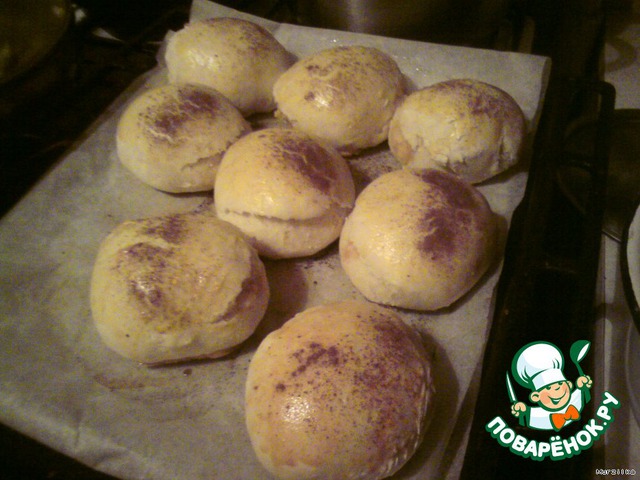 Теперь все булочки смазываем оставшимися желтками.Посыпаем корицей (если делали со сладкой начинкой)