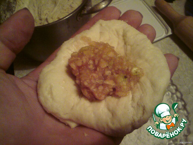 Защипываем края,разминаем аккуратно руками,чтобы начинка распределилась равномерно и скатываем в колобок