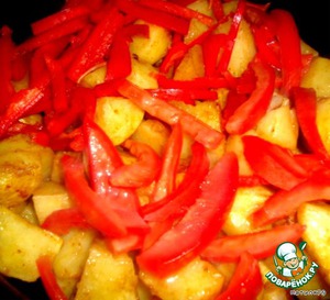 Перец почистить, нарезать полосками. Помидоры также нарезать полосками, удалив семена. Выложить к картофелю, посолить.