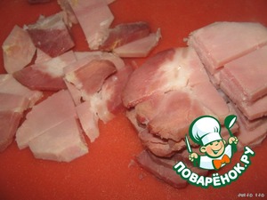 Копчёное мясо (грудинку, бекон), нарезаем ломтиками.
