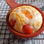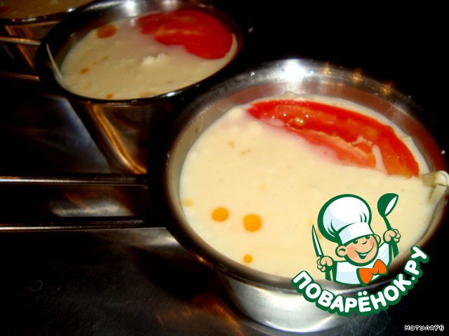 Залить взбитой яичной массой. Я положила по дольке помидора сверху. Отправляем в разогретую до 200 гр. духовку на 15-20 минут.