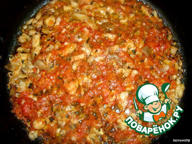 Помидоры натереть на терке до кожуры. Грибы нарезать мелко. Выложить все в сковороду с оливковым маслом, добавить соль, перец, чеснок и тимьян.