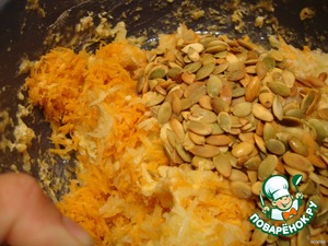 Отжать от сока кабачки и морковь, добавить к муке с яйцами, положить соль, растительное масло и тыквенные семечки. Семечки предварительно нужно обжарить на сухой сковороде до слегка золотистого цвета, чтобы они стали хрустящими. Сыр натереть на крупной терке, добавить. Замесить тесто.