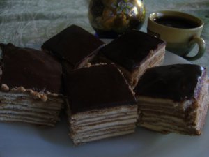 Перемазать все коржи, складывая их друг на друга. Верхний намазывать не нужно.