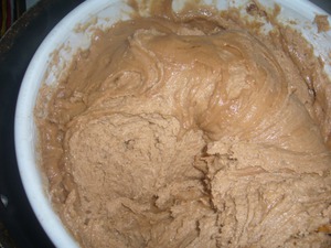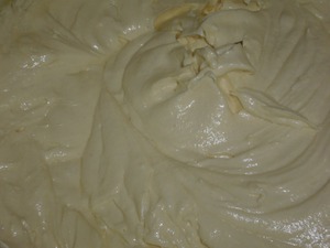Когда заваренная масса остынет, добавить в неё 300 г мягкого масла и взбить пышный крем.
