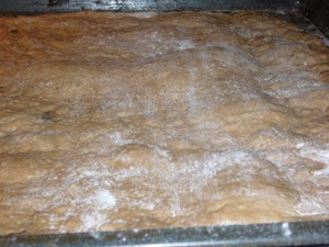 На присыпанную мукой поверхность выложить подостывшее тесто, разделить на части и тоненько раскатать. У меня протвинь большой - получаеться примерно 6-7 пластов - поэтому я раскатываю прям в протвине - тесто очень эластичное и его легко разровнять по уголкам руками.