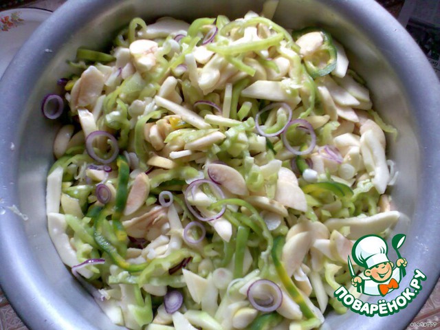 Кабачки очистить от кожицы и семян, порезать ломтиками. Яблоки нарезать дольками, болгарский перец-соломкой (очень красиво, если перчик будет разноцветный), лук порезать колечками. В эту смесь добавить растительное масло, мёд, соль и уксус, разведённый в стакане кипячёной воды. Перемешать и оставить на 1 час.
