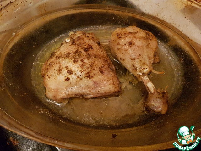 Вкладываем в неё куски курицы (смазывать форму не нужно, т. к. курица и так у нас уже в масле), и поливаем сверху оставшимся маринадом из кастрюли.