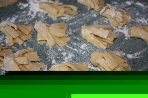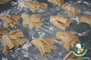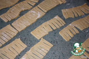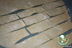 • Тесто тонко раскатать и нарезать полосками длиной около 10 см, шириной 3 см.