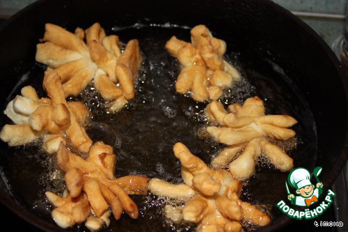 • Получилось у меня, где-то, 35 штучек-колючек. Слить (я в дуршлаг складывала) лишний жир и посыпать сахарной пудрой.