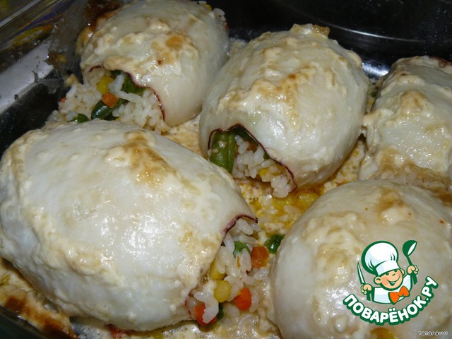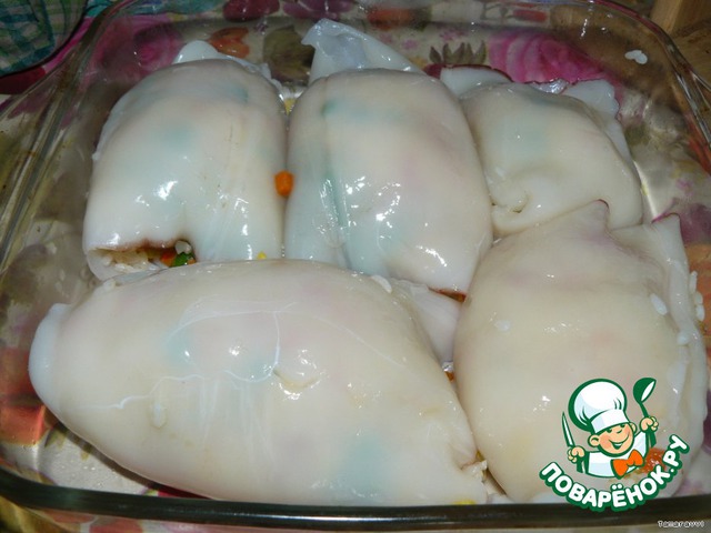 Тушки кальмара нафаршировать подготвленной рисово-овощной начинкой. Уложить в форму для запекания.