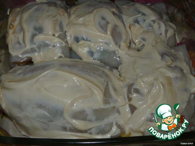 Смазать майонезом. И отправить в духовку минут на 15-20.