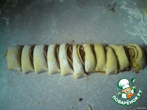 На каждый из пластов намазываем начинку и начинаем аккуратно заворачивать рулет. Хвостики рулета аккуратно срезать (они пойдут на мини-плюшки, т. к. там мало начинки). Аккулатно разрезаем рулет на кусочки толщиной примерно 2см.