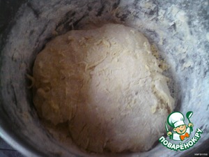 Достаем опару. Добавляем оставшуюся муку, яйца, соль, 100г масла. Тщательно замешиваем и оставляем в теплом месте. Можно поставить в чуть подогретую духовку. -