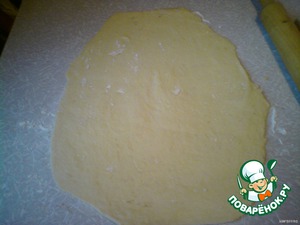 Достаем подошедшее тесто. Делим его на две части. Каждую раскатываем в пласт толщиной примерно 0,5 см.