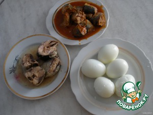 Нам понадобятся 2 баночки консервов рыбных –одна в томате, другая в масле или собств. соку. Консервы берите получше, у меня были скумбрия (можно сайру, сардину, сардинеллу….). Отварим и почистим яйца…