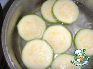 Кабачки нарезать кружочками, опустить на 1 минуту в кипящую воду вынуть , сложить на тарелку.